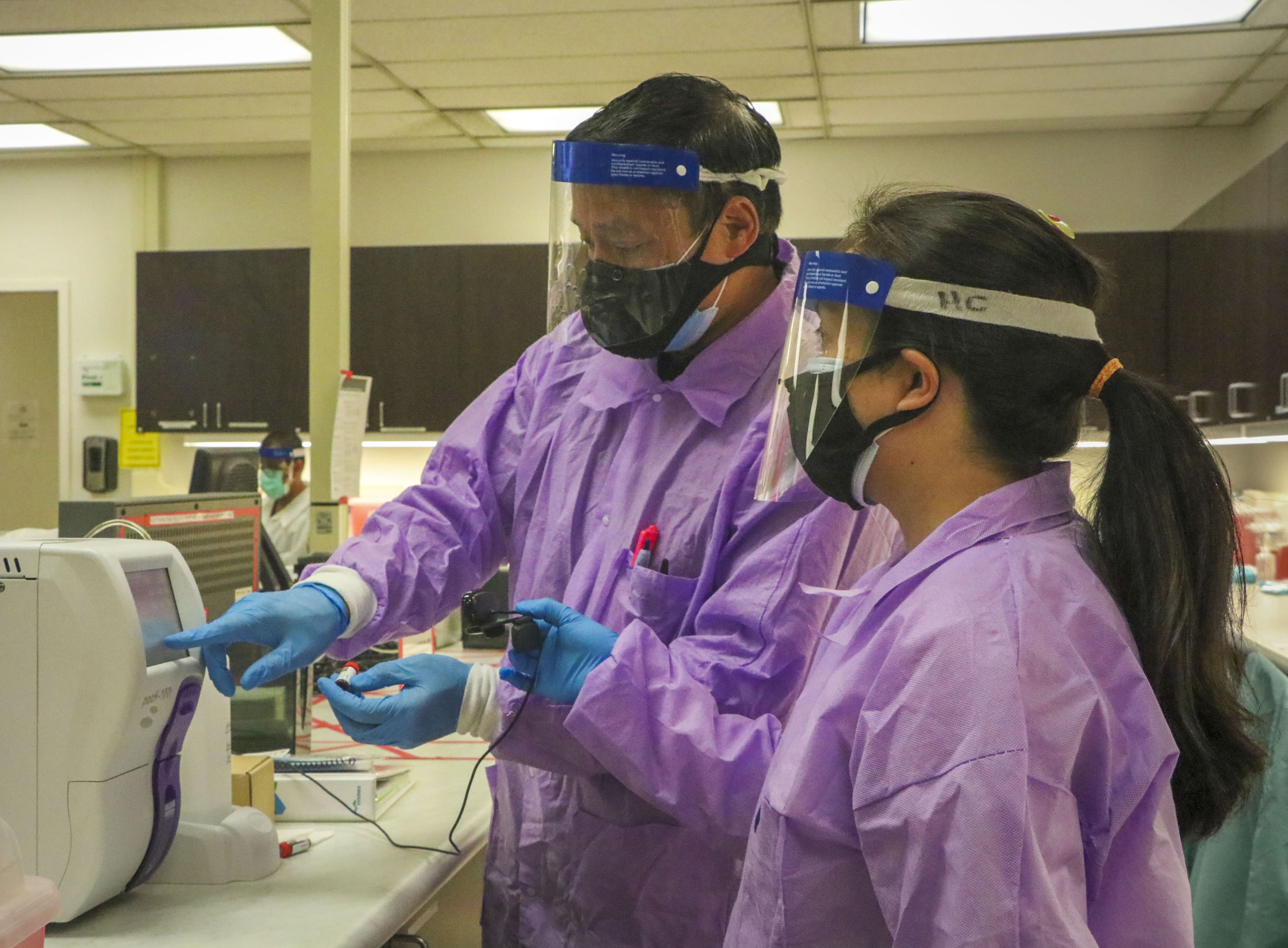 Dr. Chu filmed a lab lecture on how to operate a blood count analyzer with the help of an aide.
