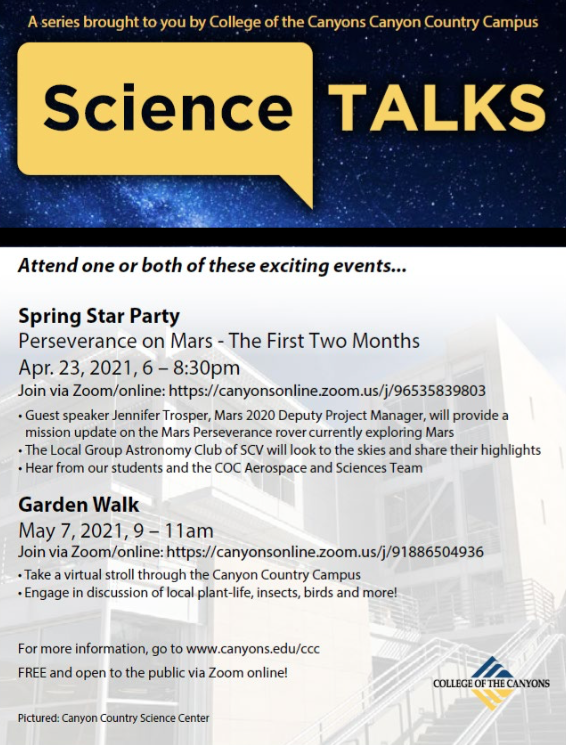 "The virtual Science Talks series continues to present timely and captivating science content for our community, including the popular biannual Star Parties," said Dr. Ryan Theule, vice president of the Canyon Country campus. "These events are an opportunity to learn more about notable science topics while also engaging with campus staff and faculty and COC programs."
